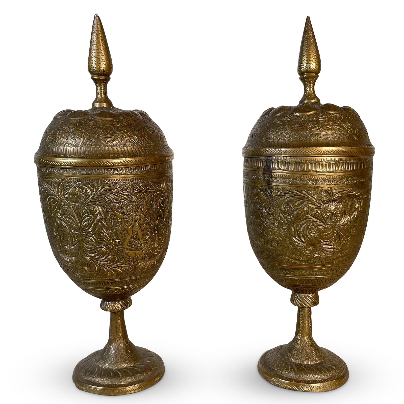 Pair of Lidded Chased Brass Anglo-indian Urns