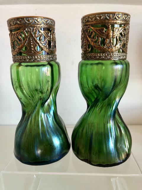 Pair of Loetz Iridescent Glass Vases Green, Art Nouveau