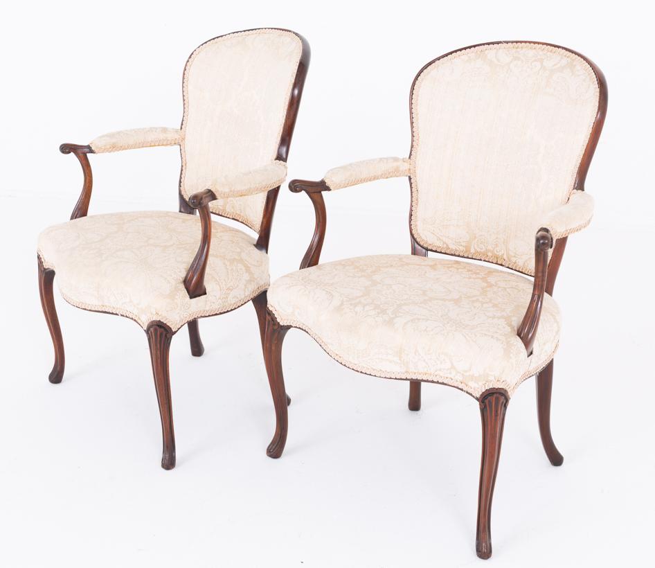 A refined pair of mahogany open armchairs in the elegant Hepplewhite style. Each chair stands on graceful cabriole front legs with swept-back rear legs, giving the pieces a balanced and sophisticated silhouette.