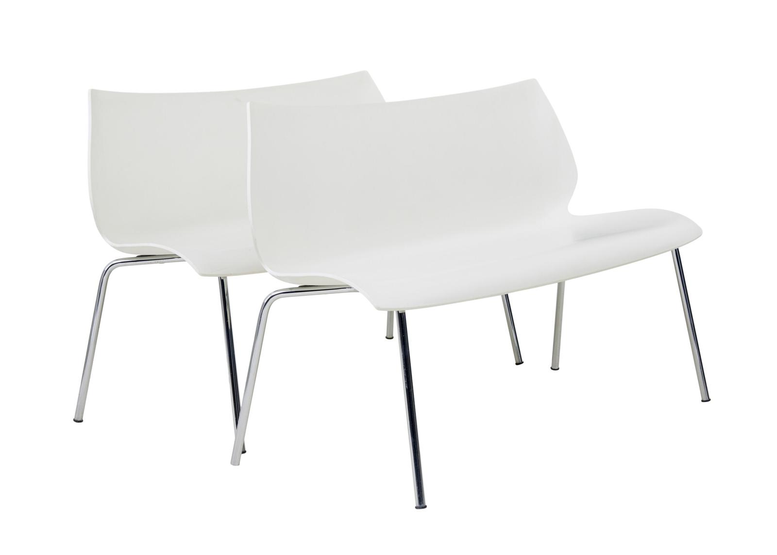Pair of maui sofas by vico magistretti for kartell circa 1980. Designed by well known italian architect and furniture designer vico magistretti (1920 - 2006) moulded plastic seats standing on tubular chromed legs. Some light marking and minor stains which should clean out, ideal for use in the home or in the garden.