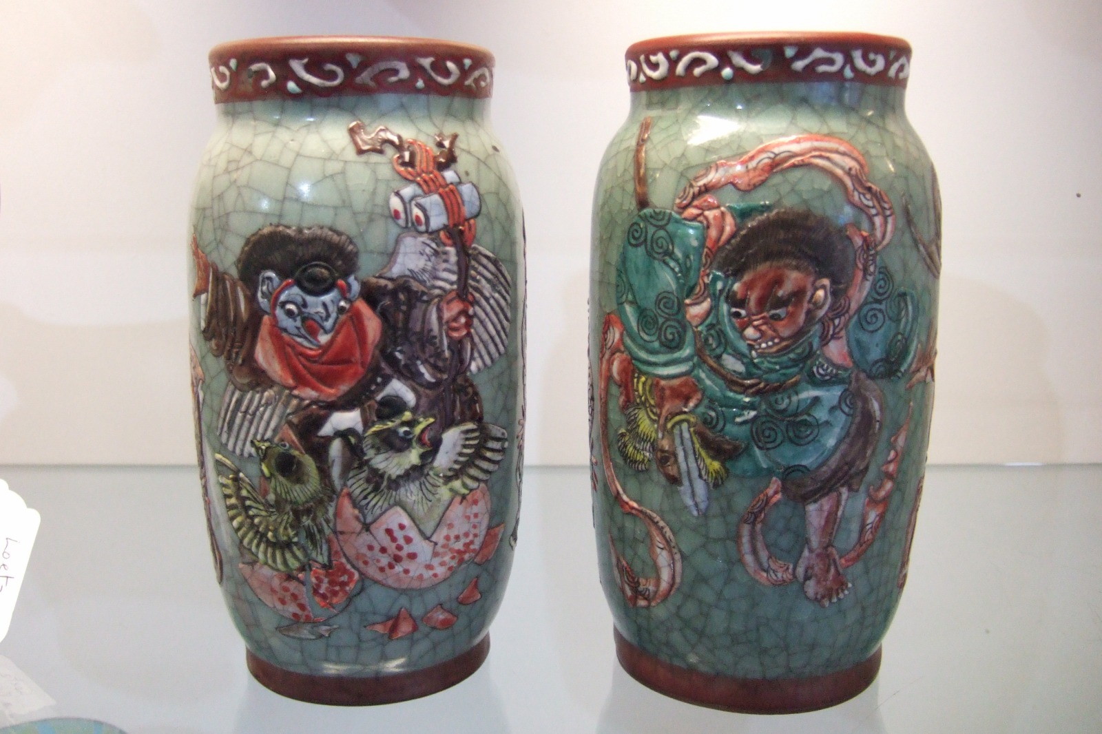 Pair of Meiji Period Japanese Sleeve Vases Adorned with Mythical Figures (1 of 4)