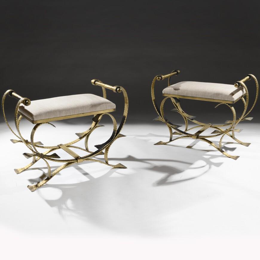 Pair of Mid 20th Century Spanish Gilt Metal & Linen Stools