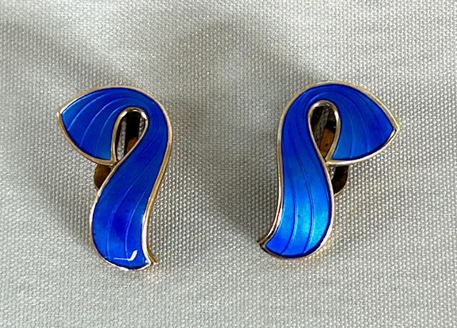 A gorgeous pair of Norwegian clip on silver earrings by Ivar T Holth. The sinuous shape is decorated with gold plating to the reverse and stunning sapphire blue guilloche enamel to the fronts. Marked Sterling , 925S, Norway and maker's mark, these are a superb and stylish pair of mid 20th Century earrings.