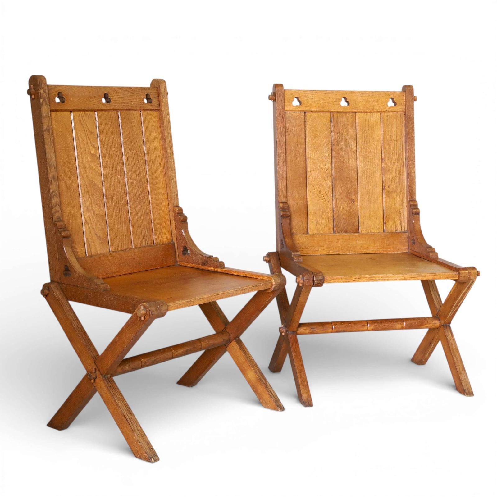 Pair of early 1900s oak Glastonbury chairs with trefoil details, X‑frame bases and mellow patina - striking Gothic Revival statement seating