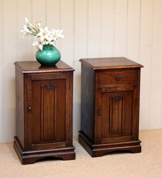 Pair of Oak Linen-fold Front Bedside Cabinets, English