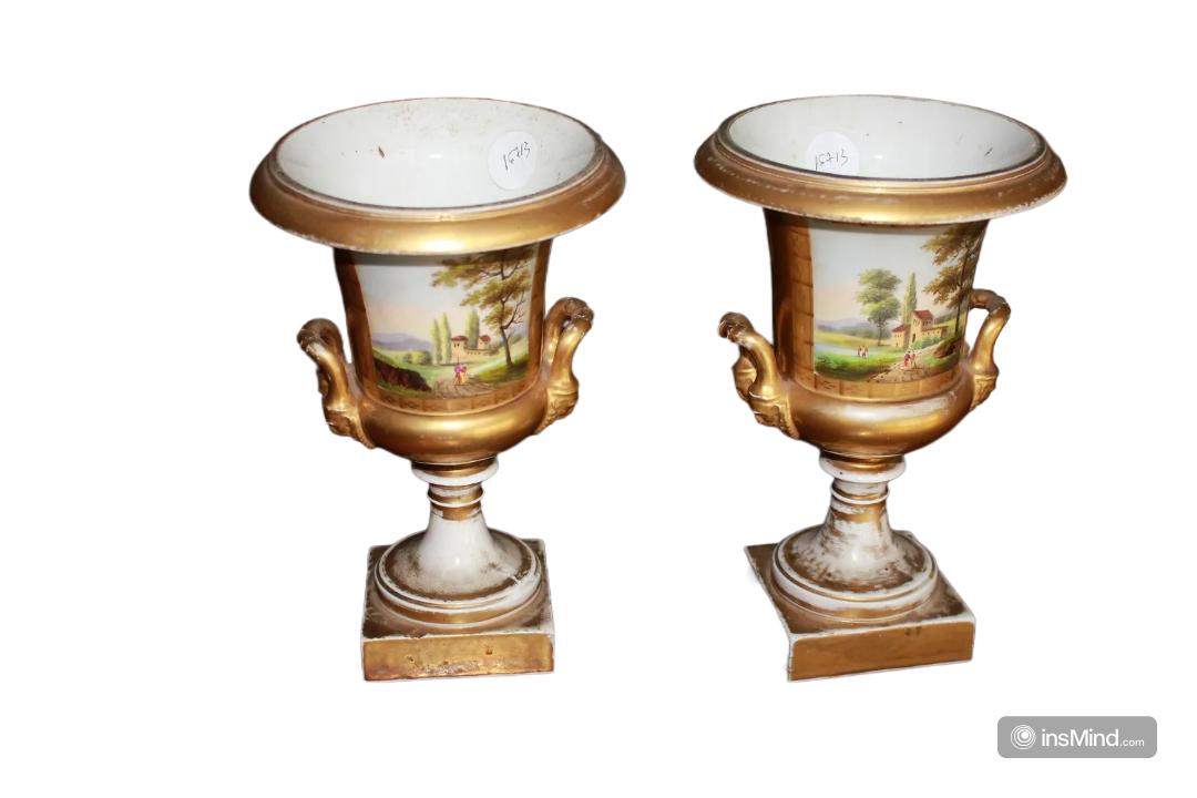 Pair of Old Paris Porcelain Crater Vases with Landscapes and Figures