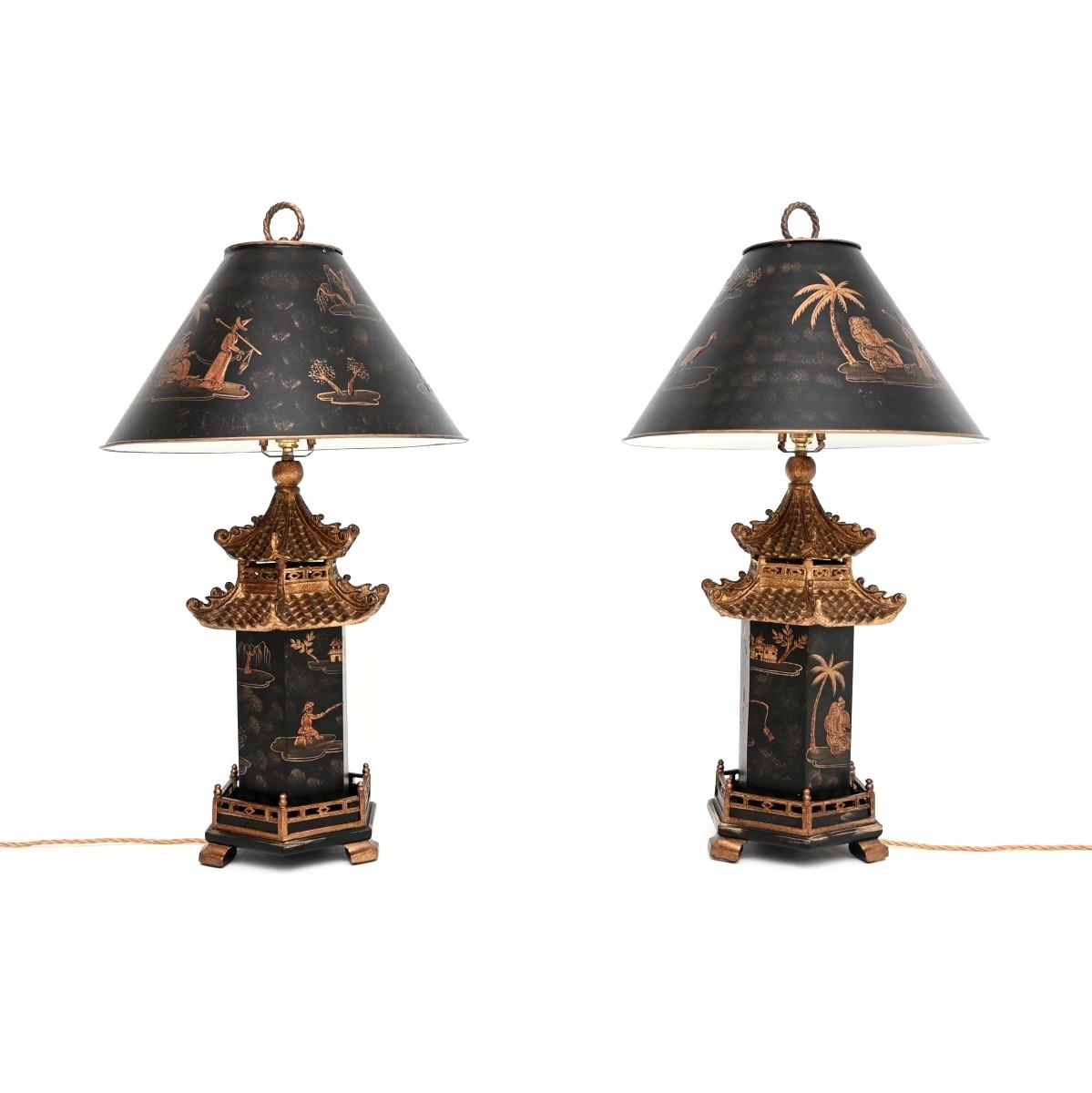 They are of superb quality, with stunning lacquered decorations throughout. The large tole shades are very impressive, they stand on pagoda style bases.