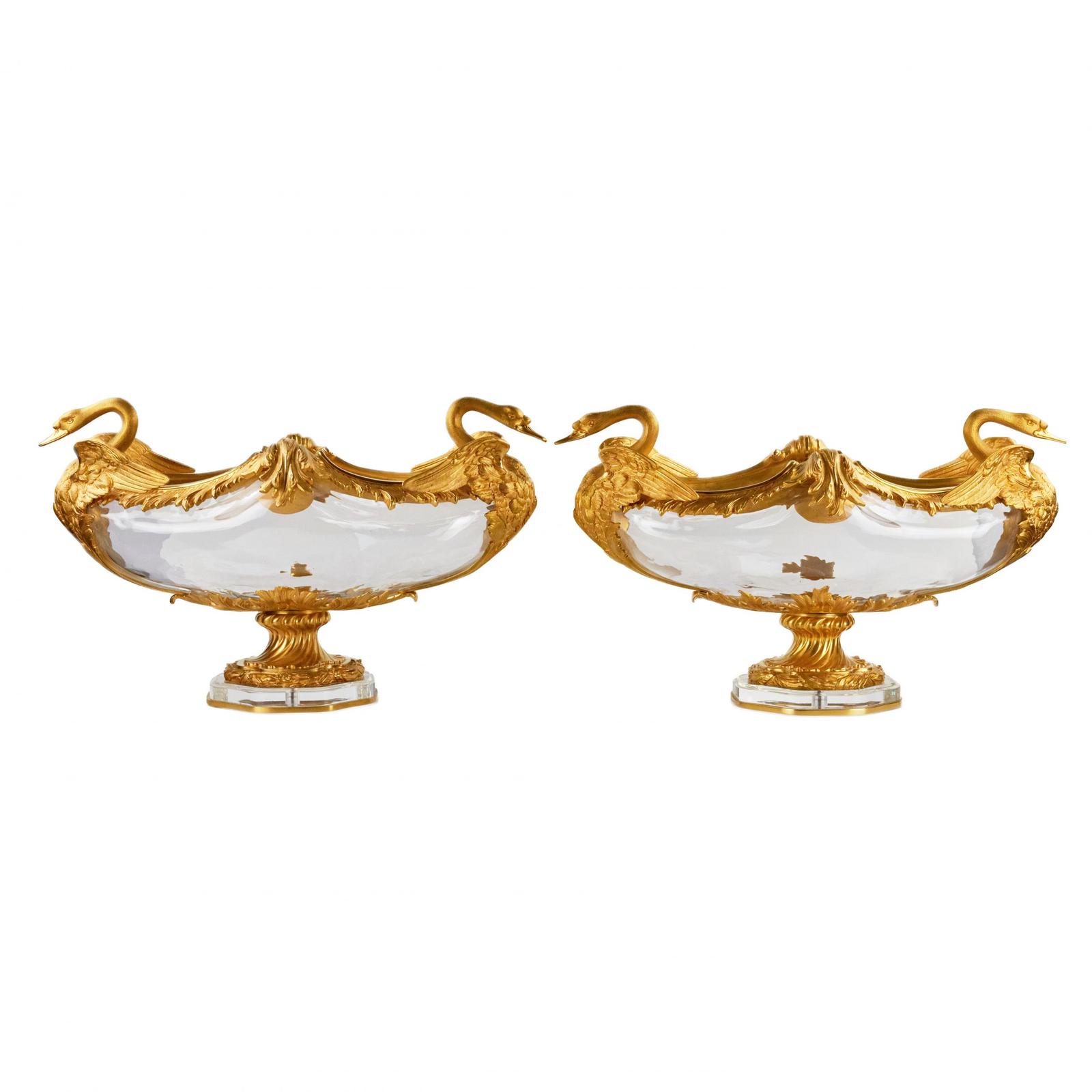 Pair of oval vases in cast glass and gilt bronze, with swan motif. France 20th century.