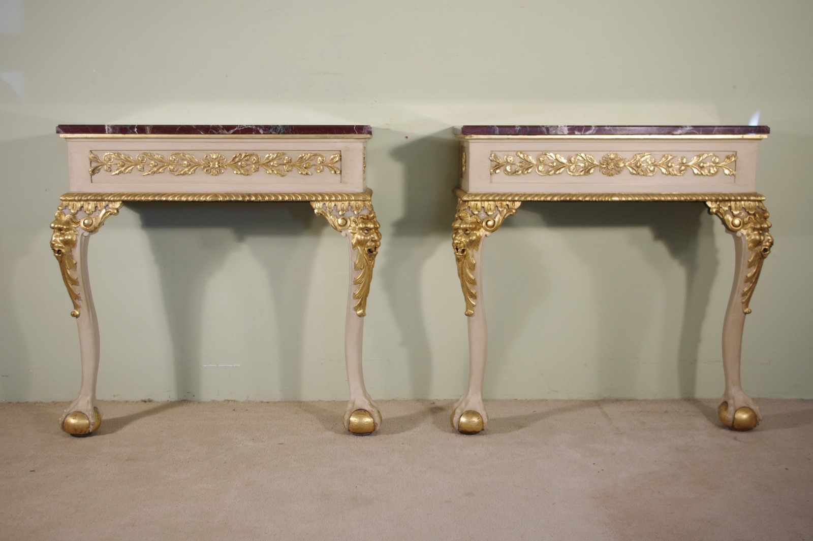 Pair of Painted & Parcel-Gilt Marble Top Console Tables