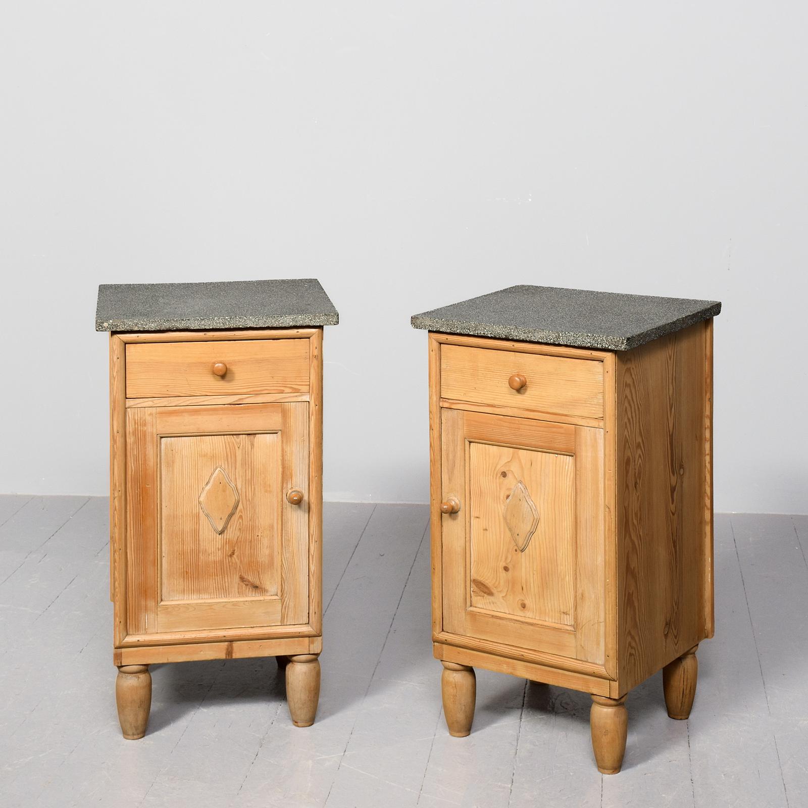 Circa 1890. A stylish pair of late Victorian, pine lockers with attractive speckled marble-tops A stylish pair of late Victorian marble-top, pine lockers. The rare and attractive, white-speckled, dark green marble tops over frieze drawers with neat, turned knobs, and shelved panel-door cupboards. Supported on turned tulip-shaped feet.