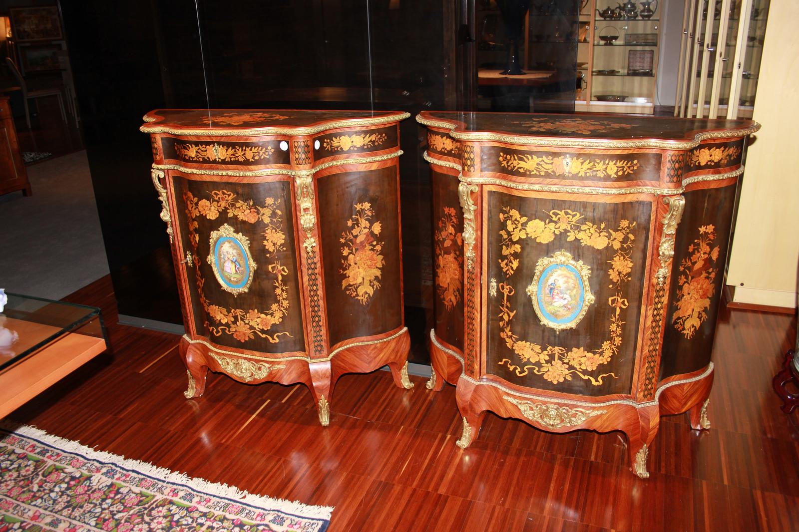 Pair of Precious Small Louis XV Style Wooden Cabinets Richly Inlaid with Sevres Porcelain Medallion