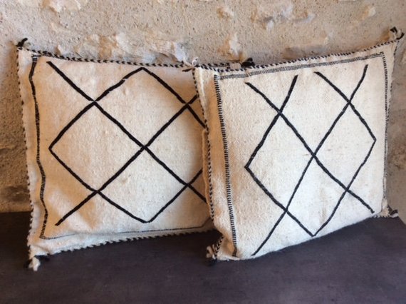 Pair of Pure Wool Berber off White Rug Cushions with Black Geometric Pattern 44 cm Sq