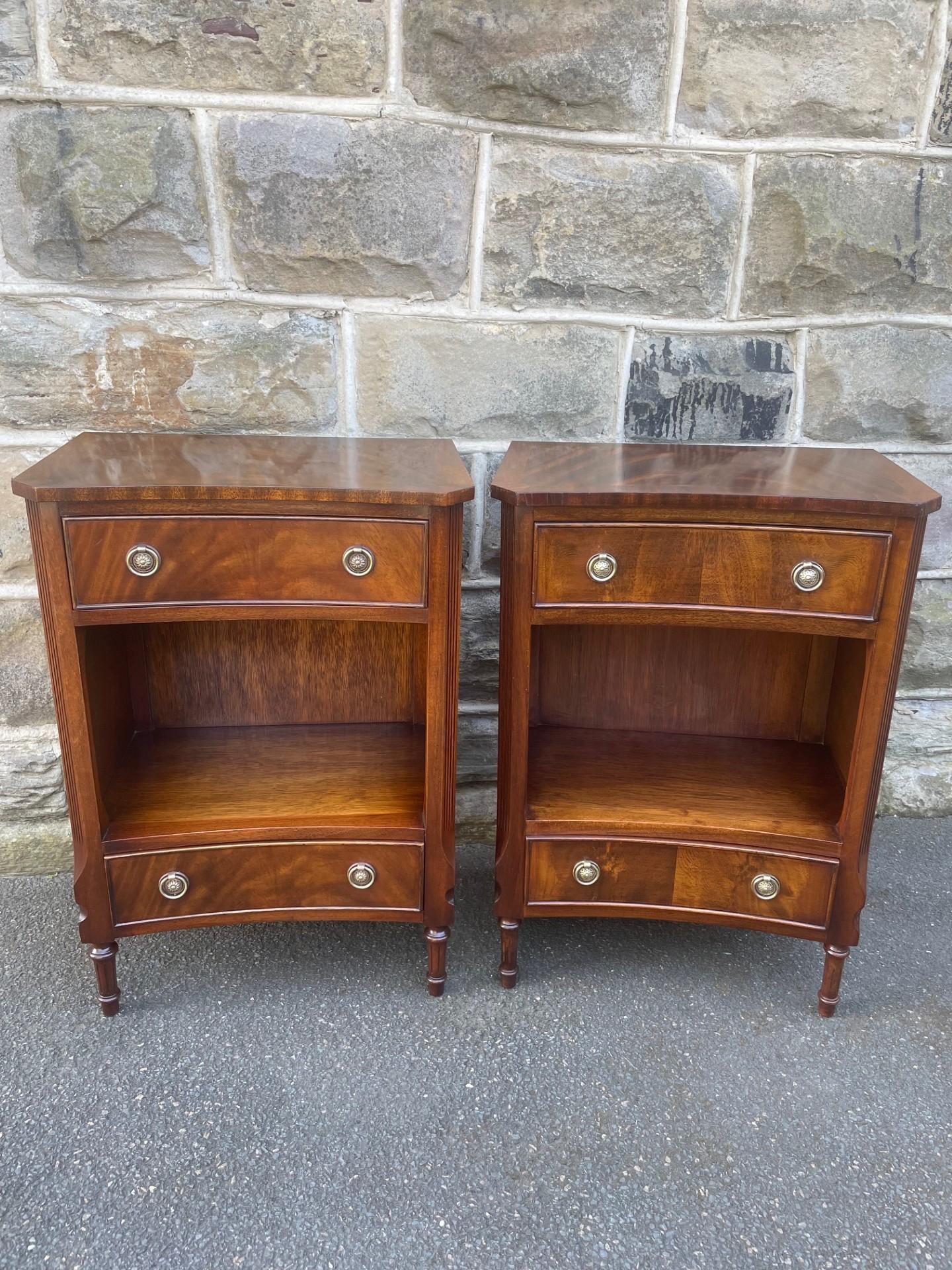 Offered for sale is this quality pair of early 20th Century bedside cabinets in mahogany, concave curved fronts, draw above open storage area with another draw to the bottom. Polished mahogany sides with reeded columns standing on turned reeded legs.