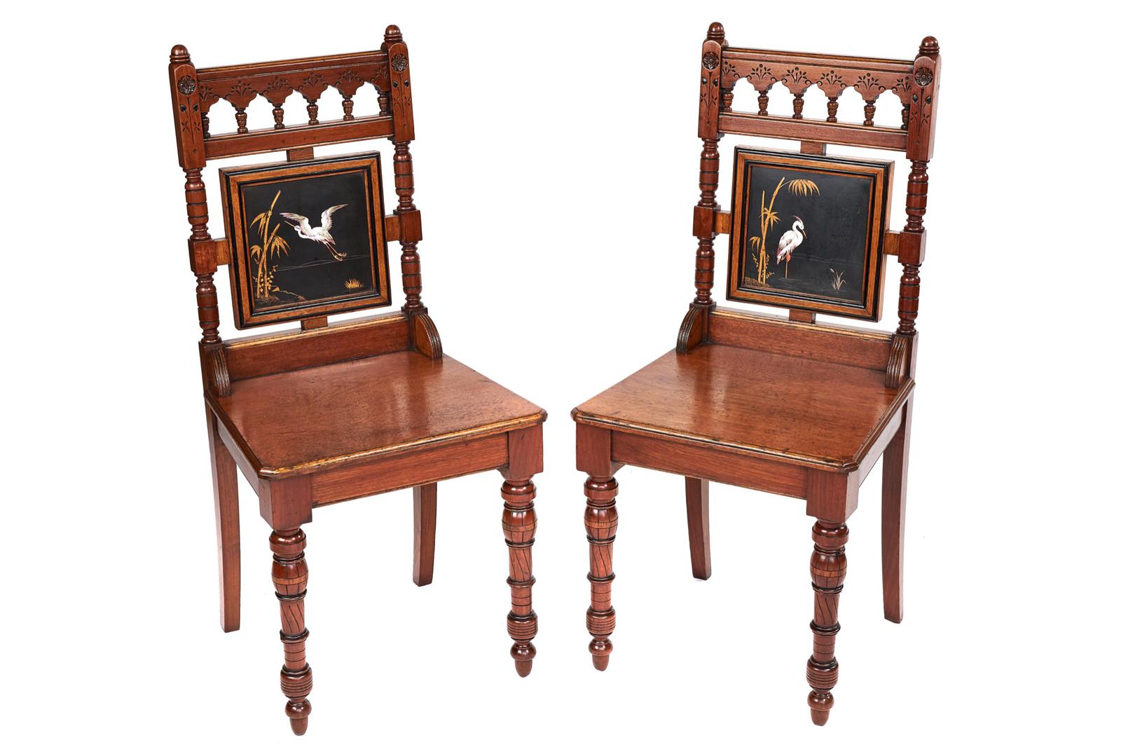 Pair of quality walnut Aesthetic period hall chairs, with Minton inset tiles