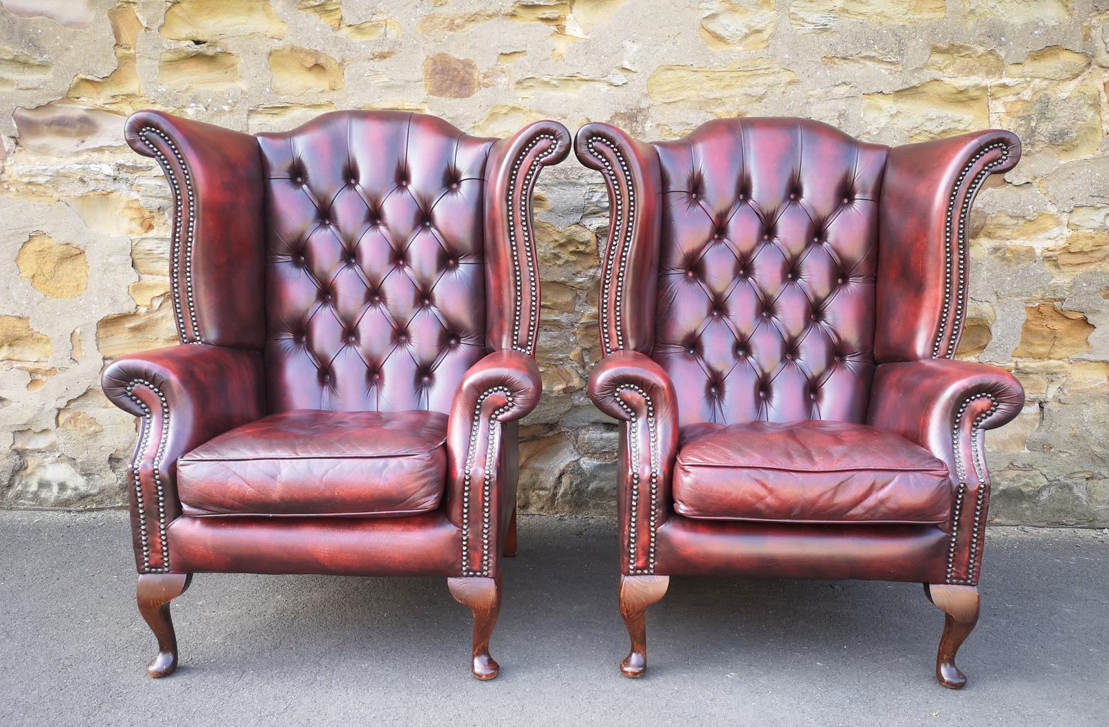 Pair of Queen Anne Leather Chesterfield High Back Armchairs