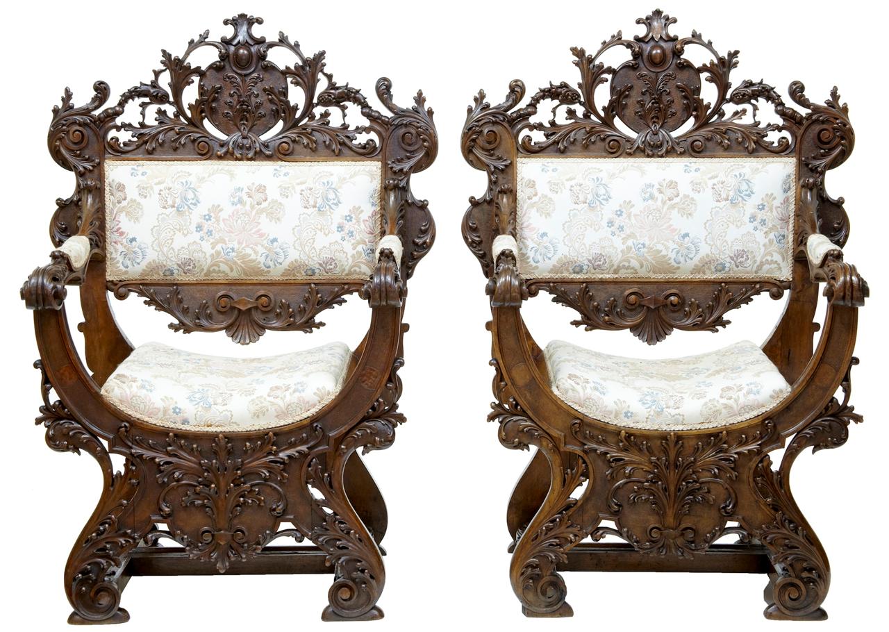 Pair of Rare 19th Century Savonarola Dantesca Italian Walnut Throne Armchairs (1 of 1)