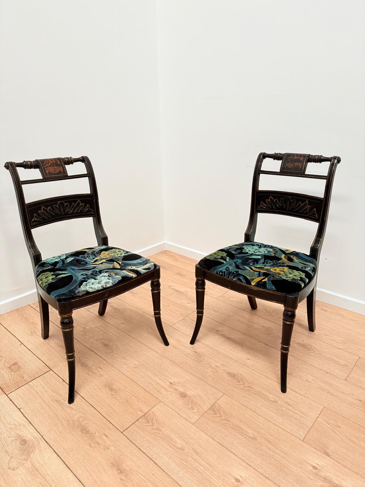 Delve into the elegance of the 19th century with this exquisite pair of Regency side chairs.