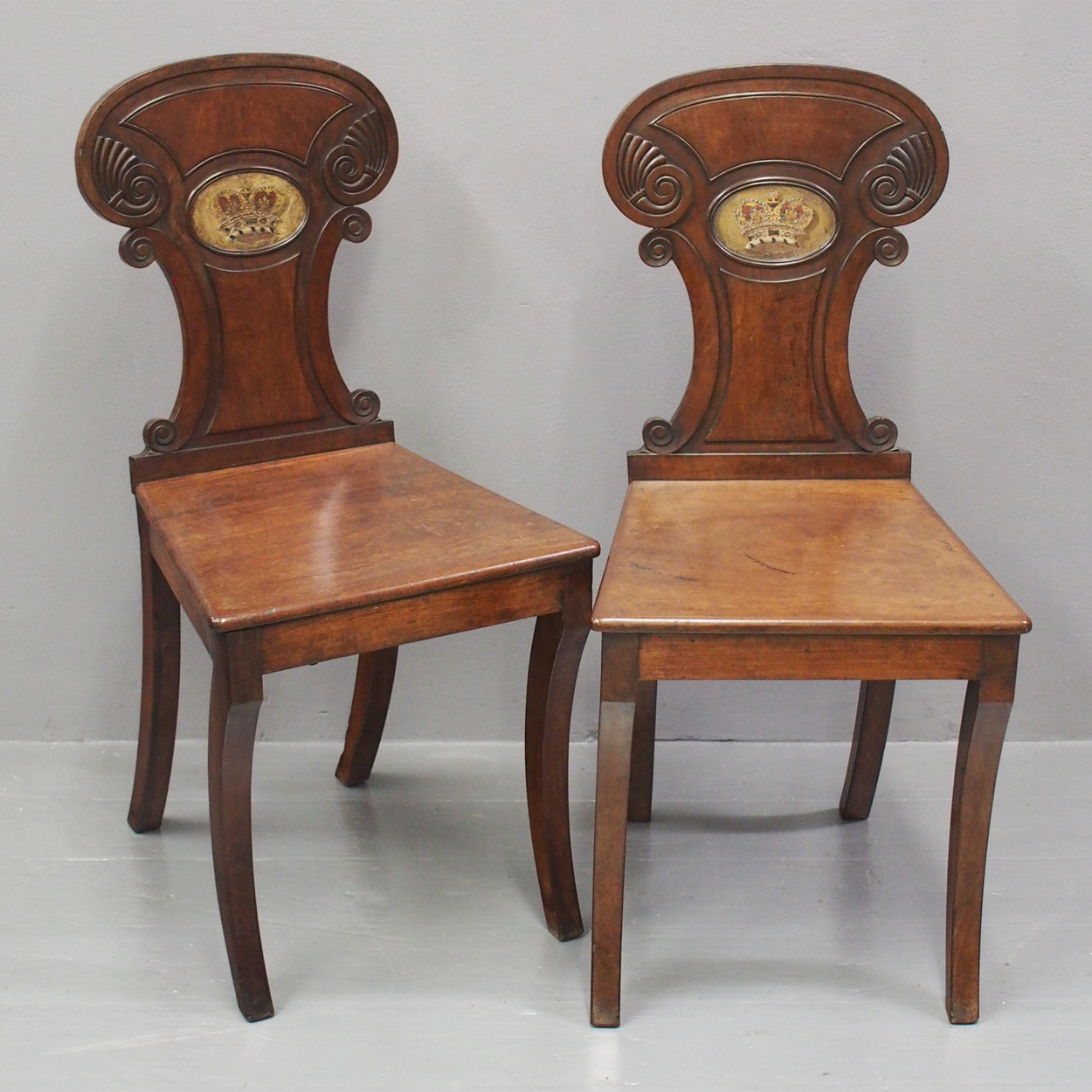 Pair of Regency Mahogany Hall Chairs with Painted Coronet