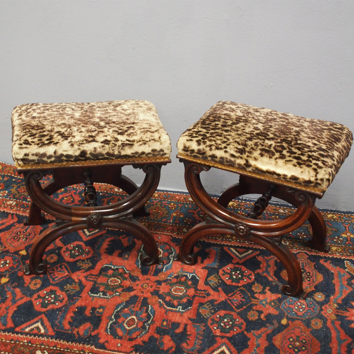 Pair of Rosewood & Leopard Print Top Stools