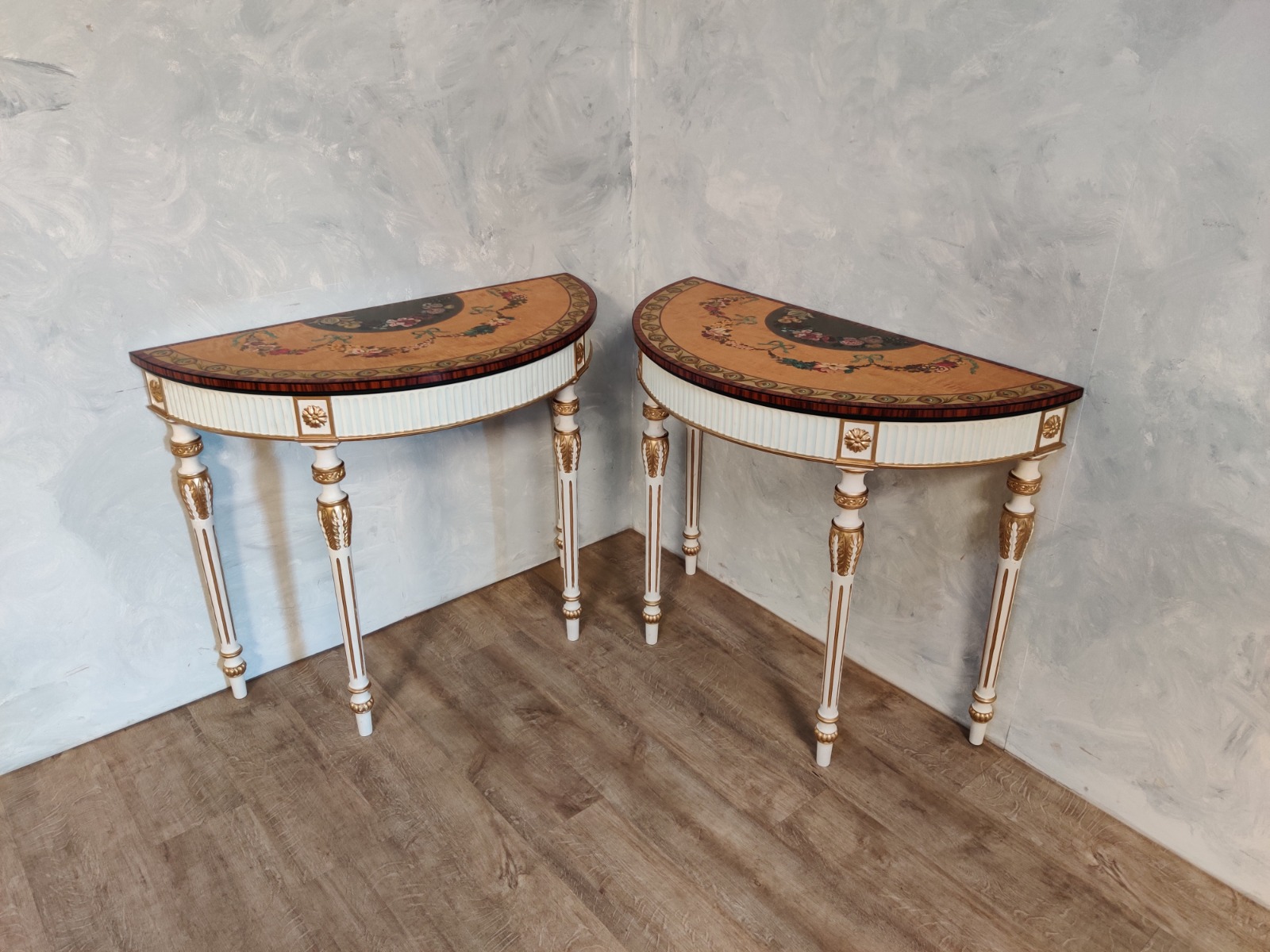 Pair of Satinwood Painted Demilune Tables