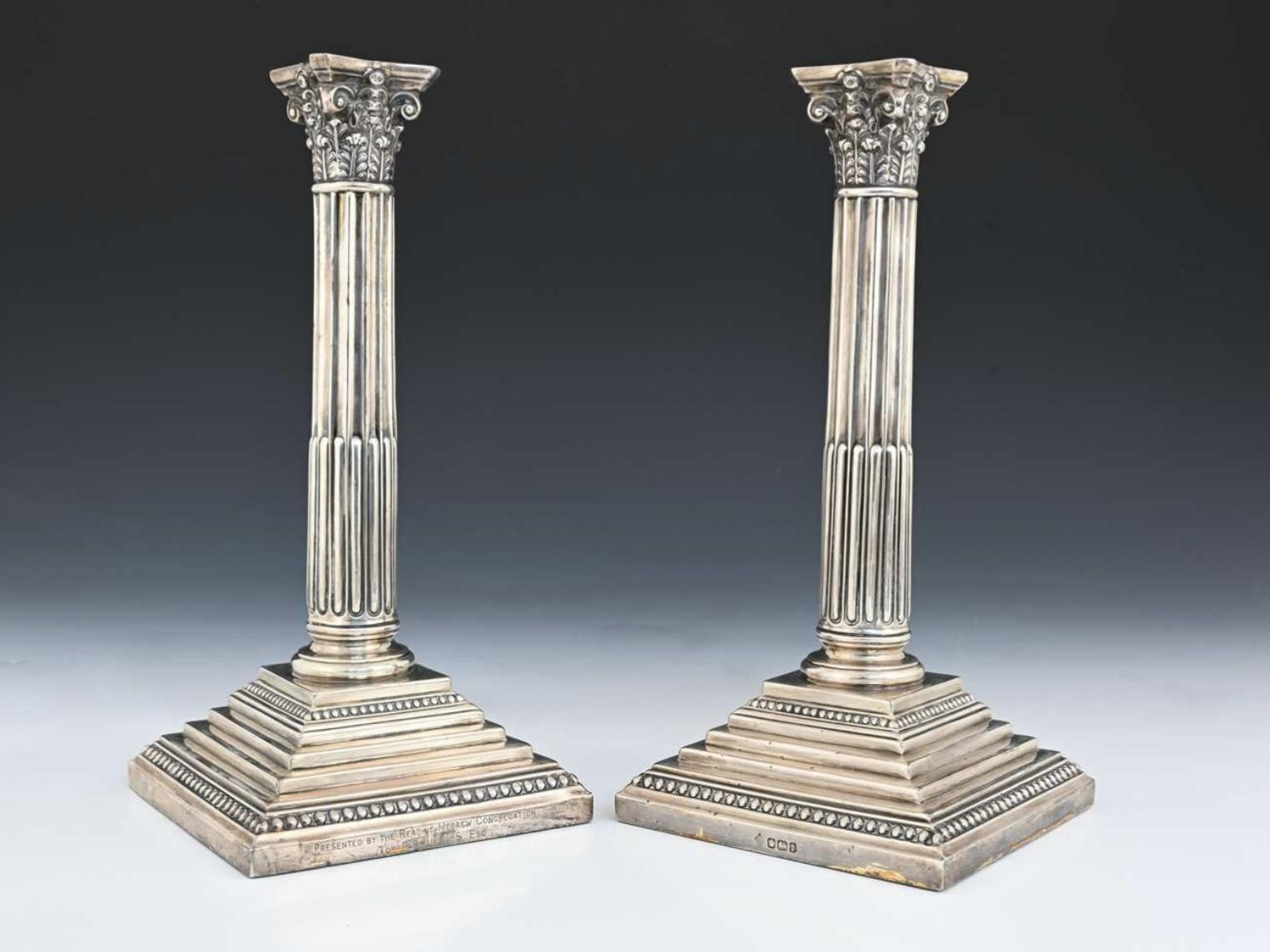 Pair of Silver Corinthian Column Candlesticks Sheffield 1911