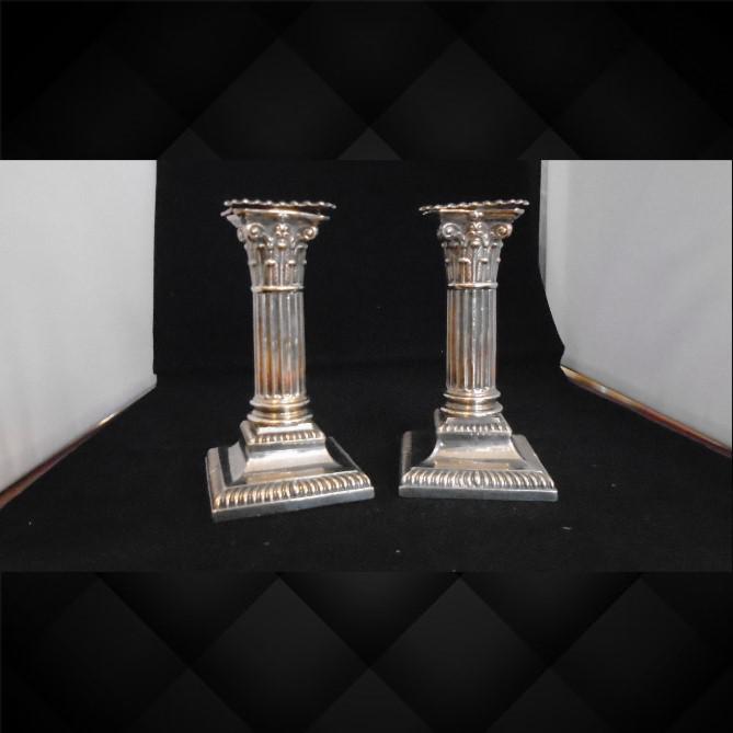 Pair of Silver Dwarf Corinthian Column Candlesticks