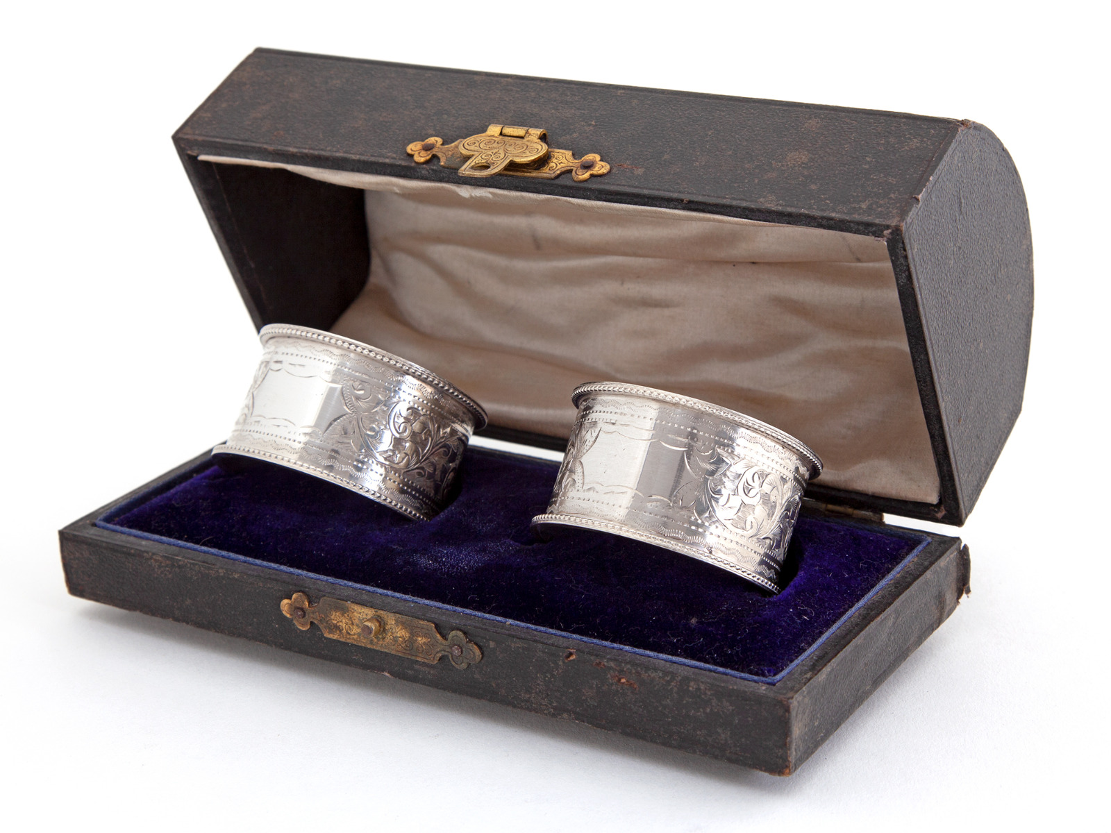 Pair of Silver Edwardian Napkin Rings Fitted in a Black Domed Top Box