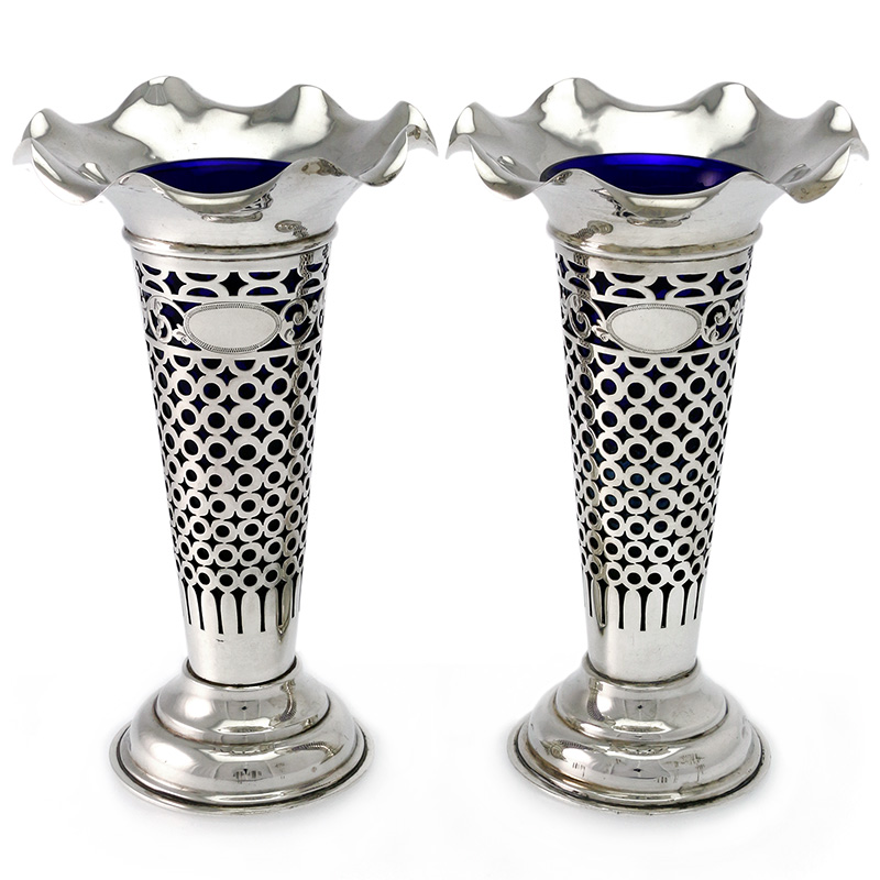 Pair of Silver Vases with Pierced Body & Blue Glass Liners (1 of 1)