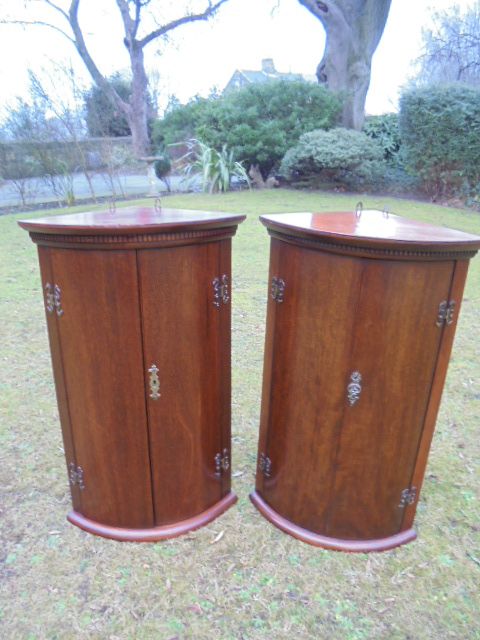 Pair of Small Antique Mahogany Barrel Front Corner Cupboards