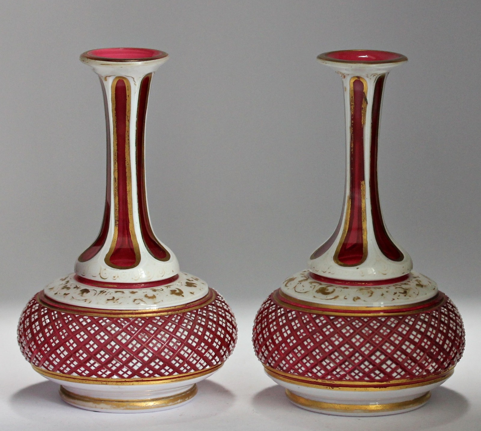 Pair of Small Bohemian White Cut to Ruby Glass Solifleur Vases