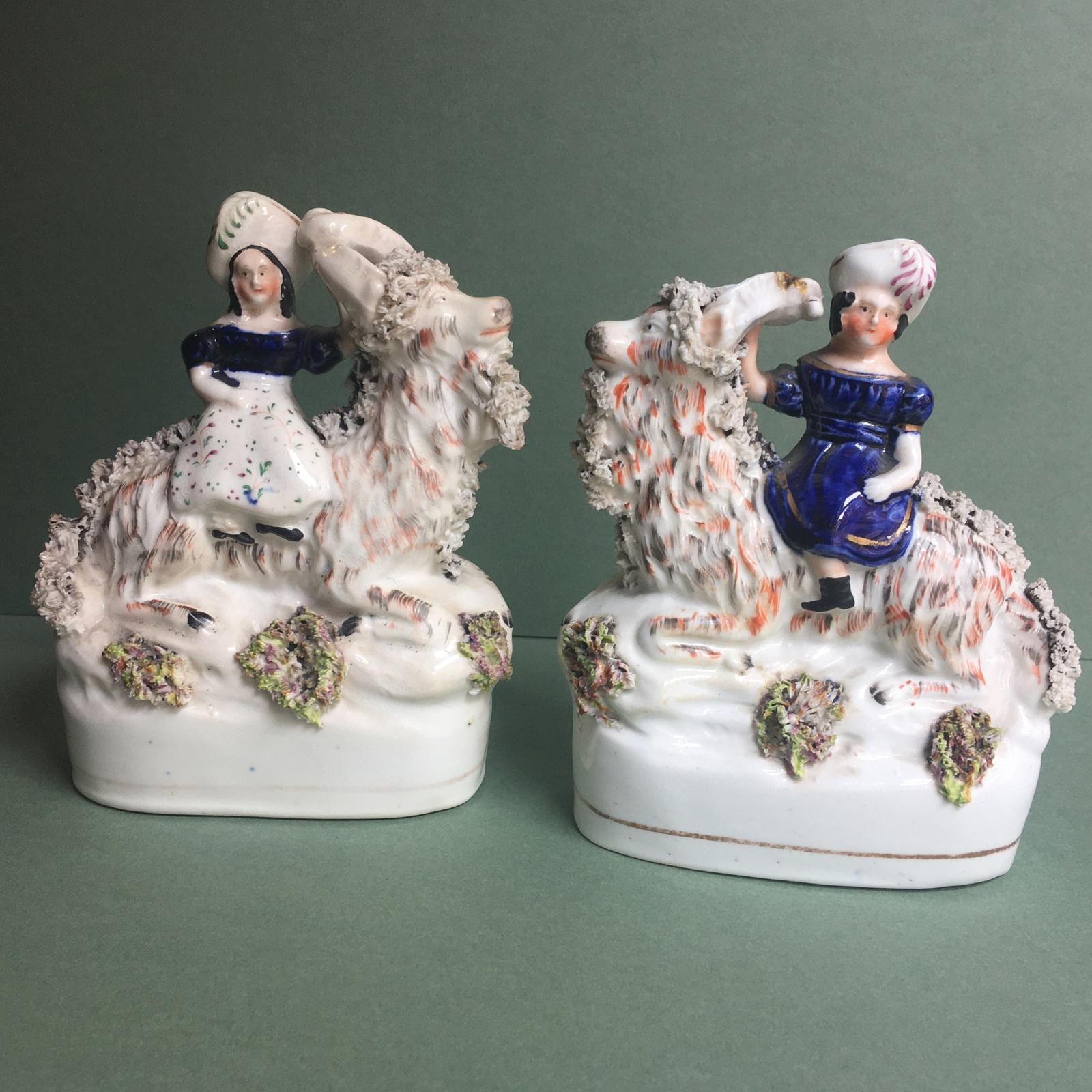 Pair of Staffordshire Figurines of Dear Children on Very Large Goats