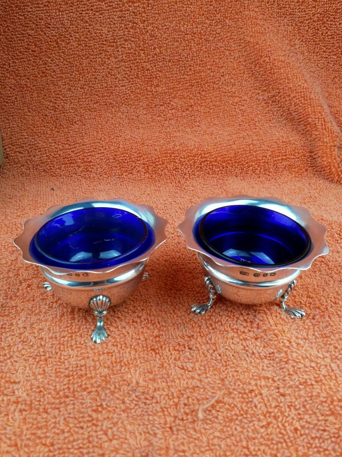 Pair of Sterling Silver Hallmarked Salt Cellar Pot with Blue Glass Liner
