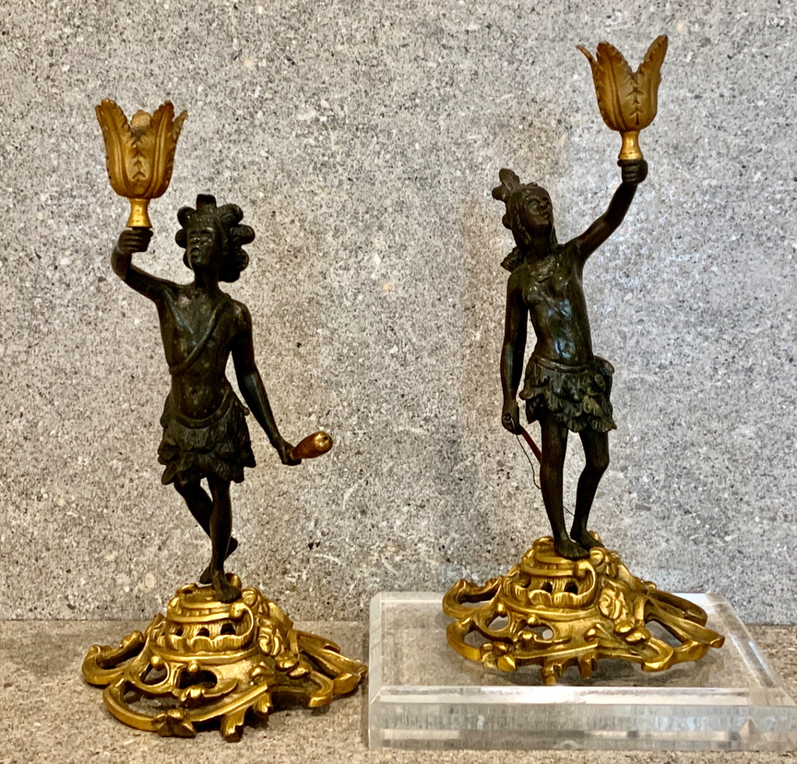 Pair of Superb Bronze Patinated Cast Iron Candlestick Figures, Russian