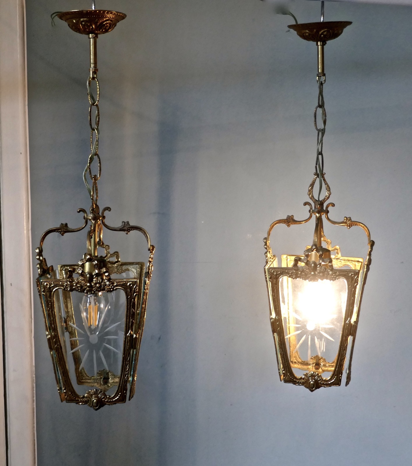 Pair of Superb Quality French Rococo Brass and Etched Glass Lantern Hall Lights