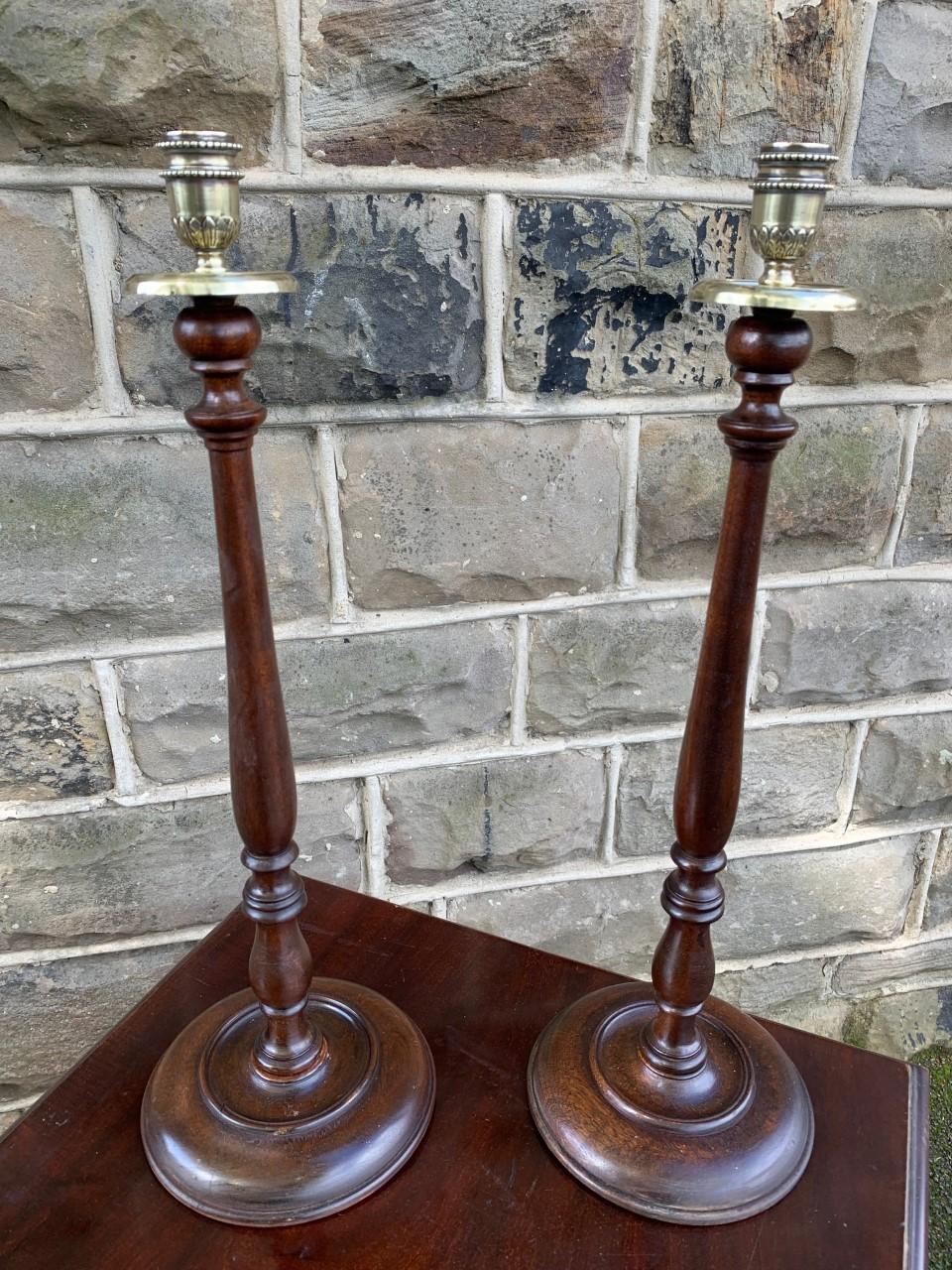 Pair of Tall Antique Mahogany & Brass Candlesticks