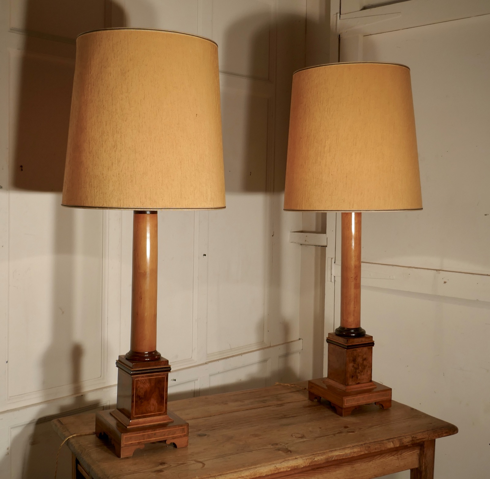 Pair of Tall Art Deco Maple and Walnut Column Table Lamps