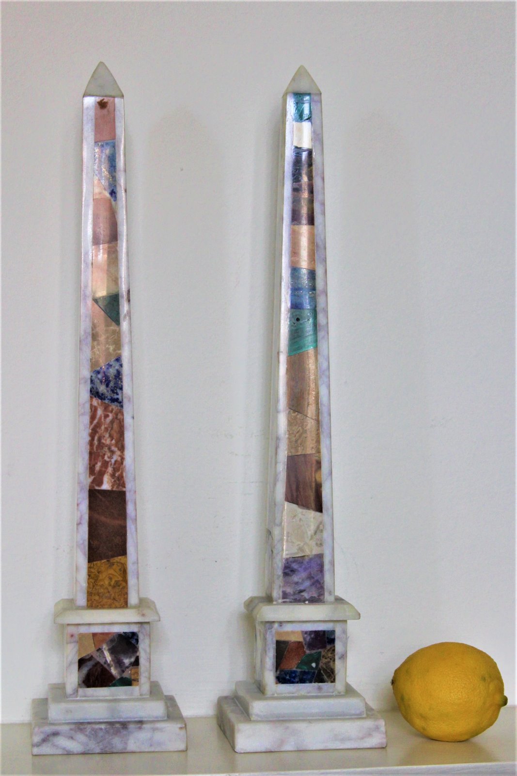 Pair of Tall White Marble Obelisks with Various Coloured Specimen Marbles Inlaid To the Front Italian c.1930