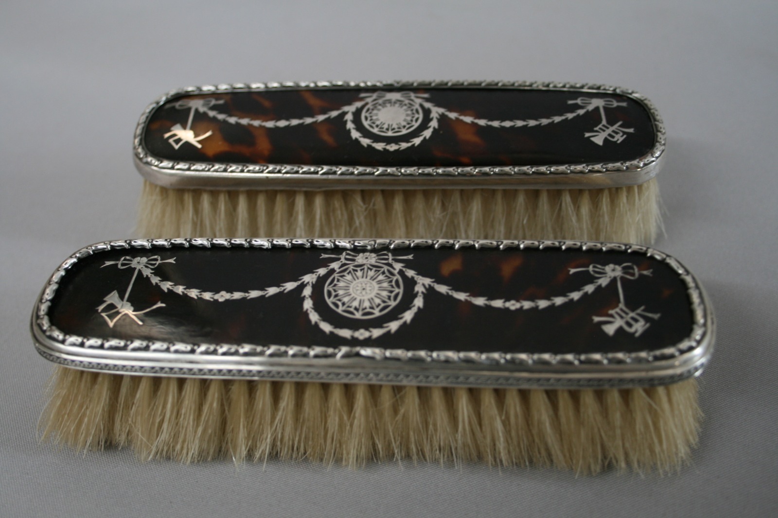 Pair of Tortoiseshell & Silver Pique Work Inlaid Clothes Brushes (1 of 3)