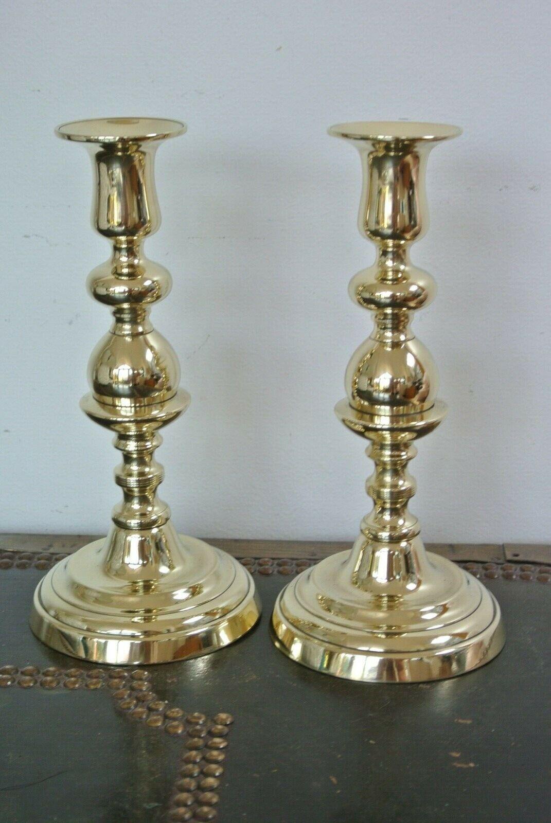 Pair of Unusual Acorn Victorian Brass Candlesticks Round Base Pushers c.1860