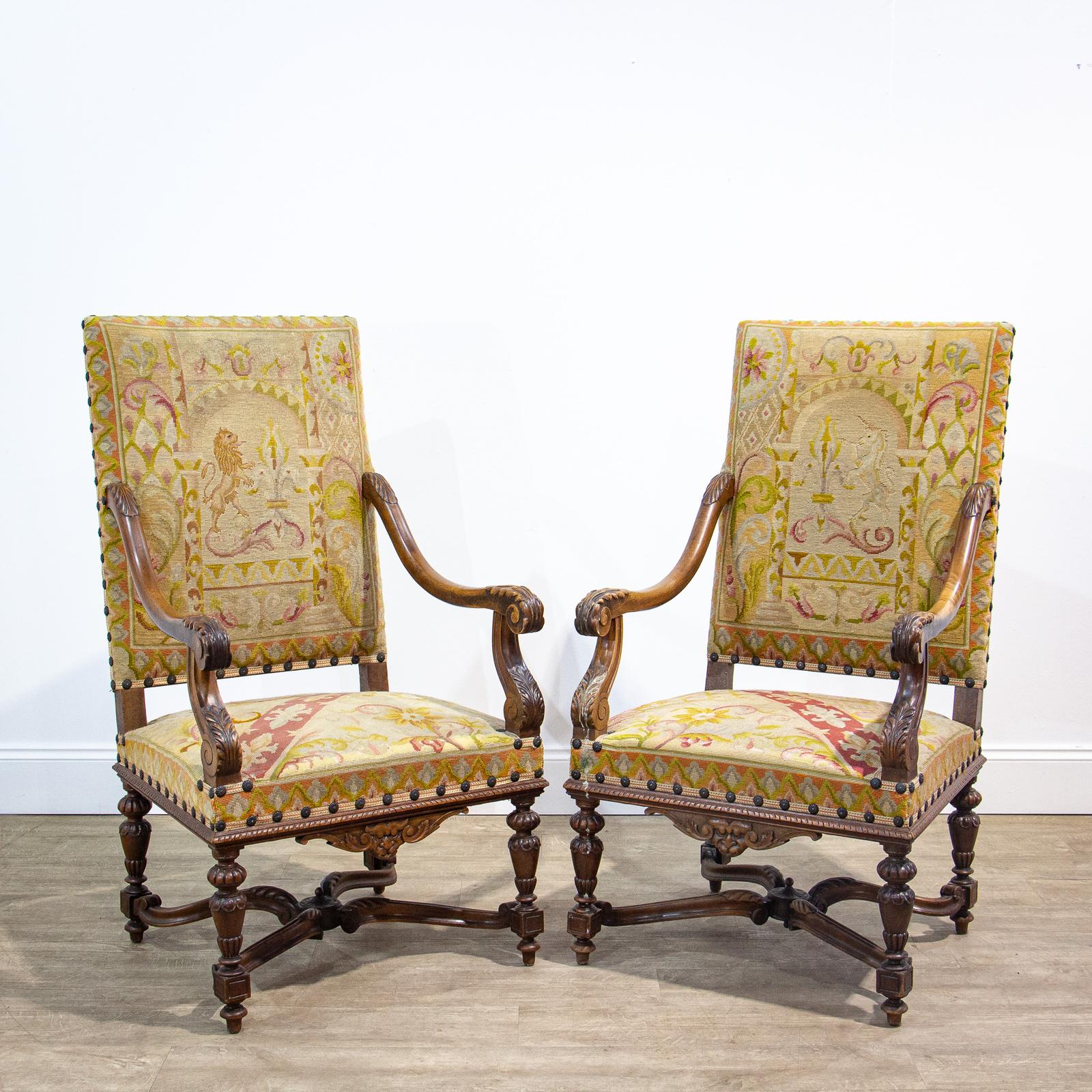 A handsome pair of high back armchairs in the French style, these have large, comfortable seats with a tapestry upholstery showing a heraldic design. They will look wonderful in a large entrance hall, or a good size dining room at either end of a large table.