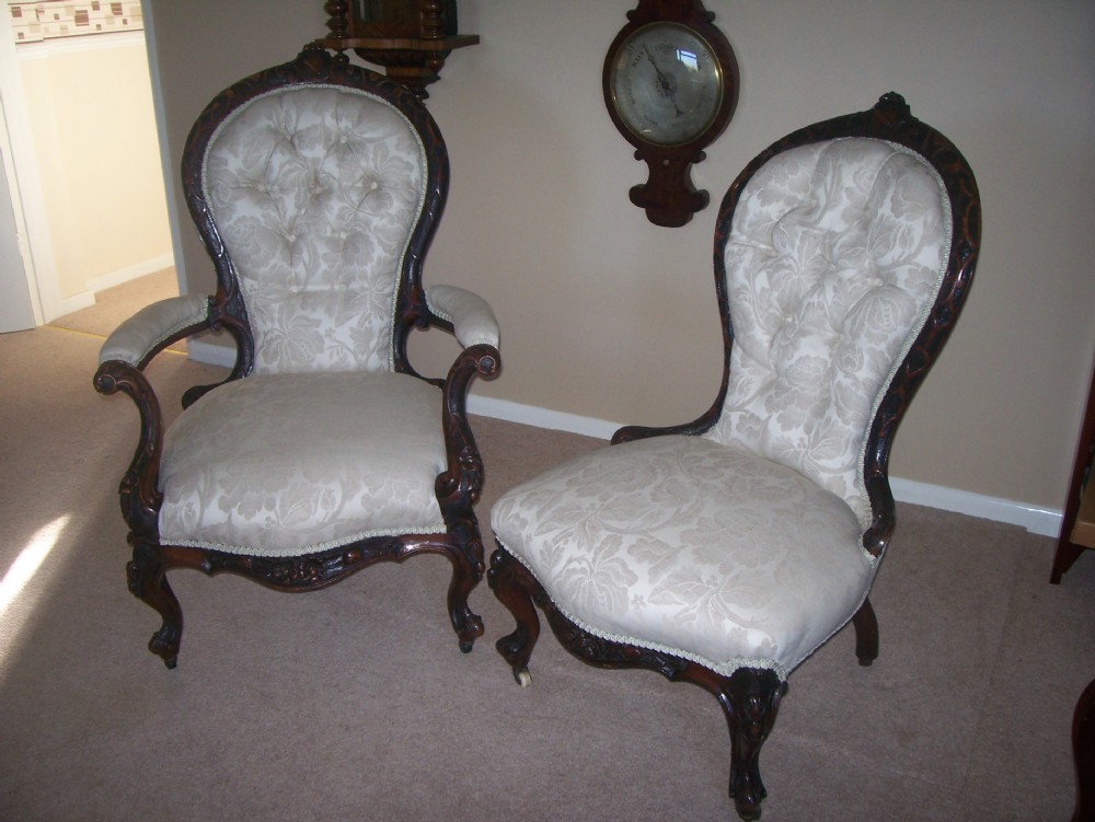 Pair of Upholstered Ladies & Gents Walnut Showframe Chairs c.1860 (1 of 1)