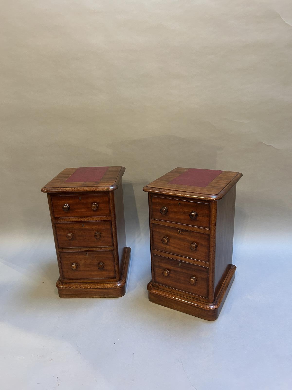 Pair of late 19th Century Victorian antique figured mahogany of good colour and (adapted) good shallow proportions, the moulded edge tops inset with leather over 3 graduated drawers with knob handles, raised on plinth bases.