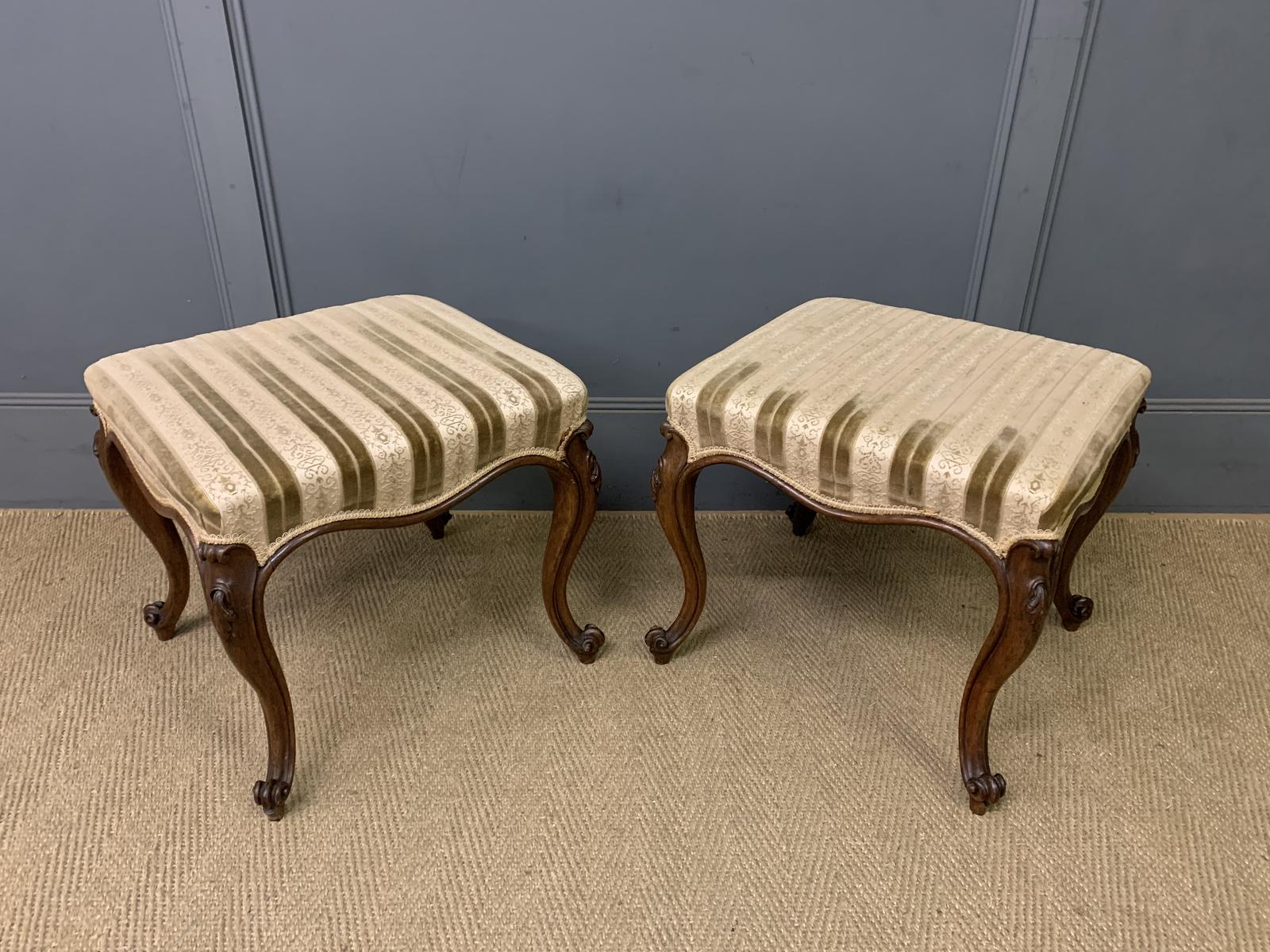 A very nice pair of mid-Victorian period stools. The frames in solid rosewood , with over-stuffed upholstered seats. With cabriole legs with carved details to the knees. Bearing the original makers stamp for Hindley Son (probably Charles Hindley & Sons) and a retailers label for B Taylor & Sons. Cleaned and waxed in our workshops and now offered for sale in very good original condition. Some very minor marks to the upholstery.