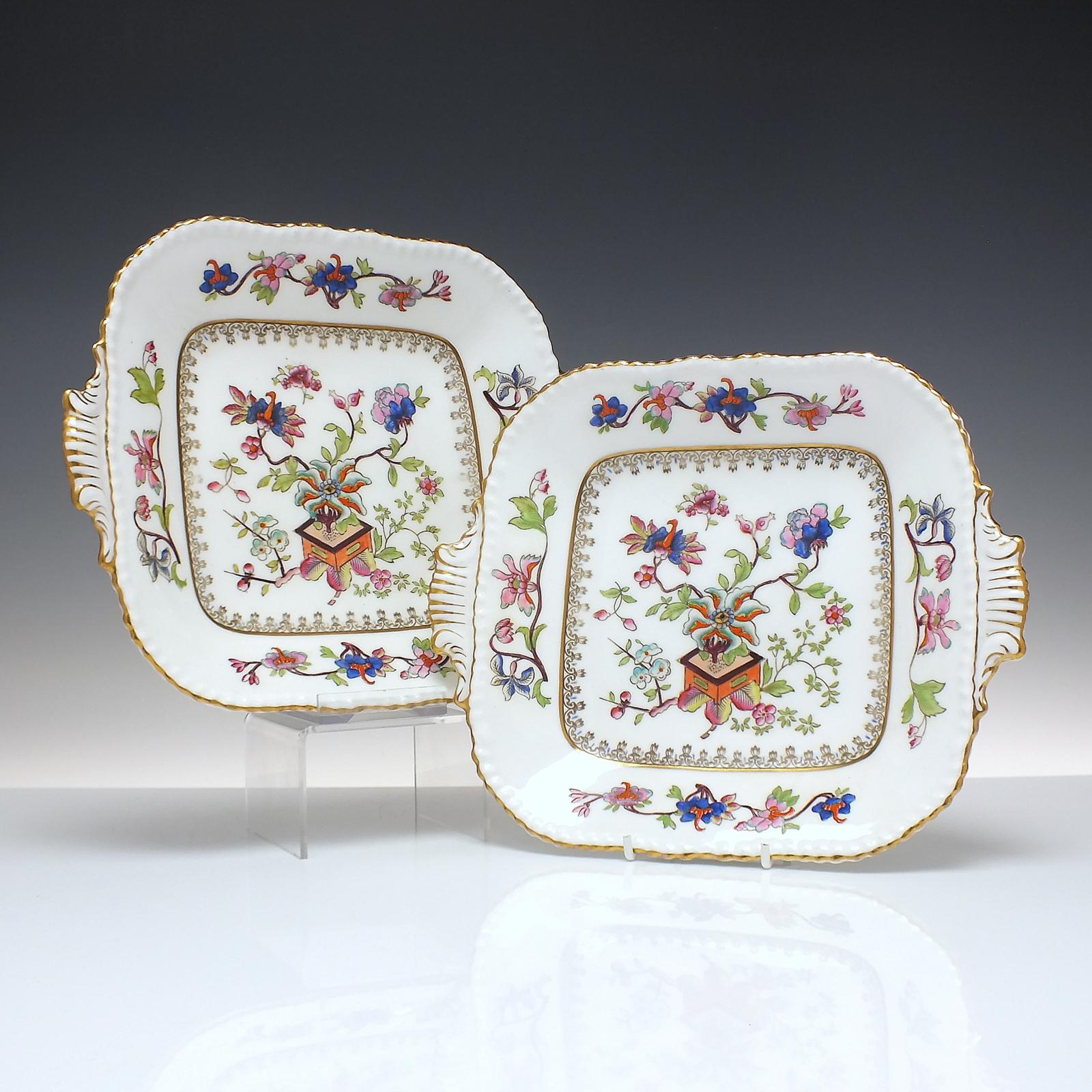 Pair of Victorian Coalport Square Handled Serving Plates in Flower Pot Pattern c.1900