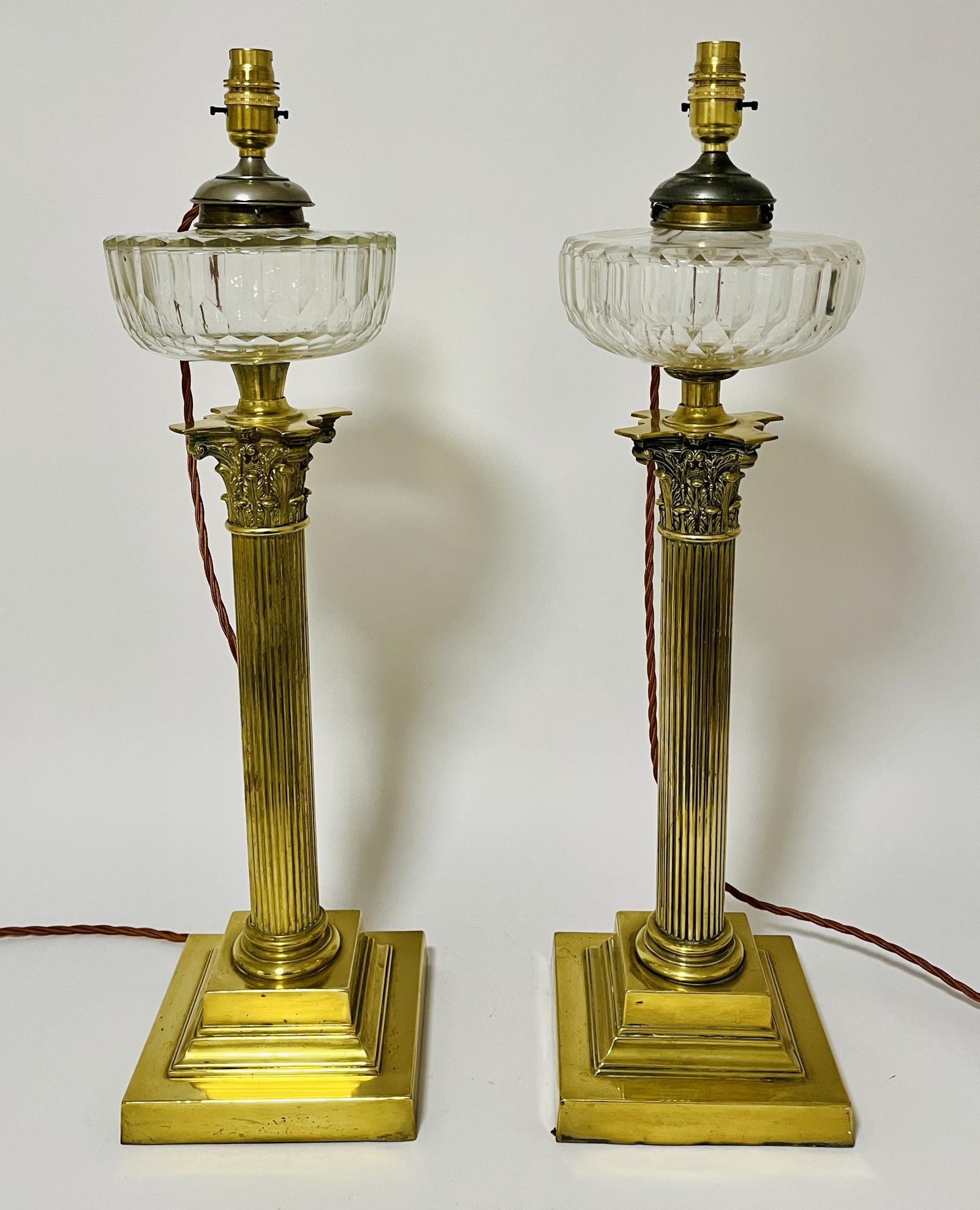 A pair of large brass Corinthian column table lamps dating from the late 19th / early 20th century. They have the traditional column design set on square stepped bases. They were originally oil lamps and both have their original glass oil reservoirs.