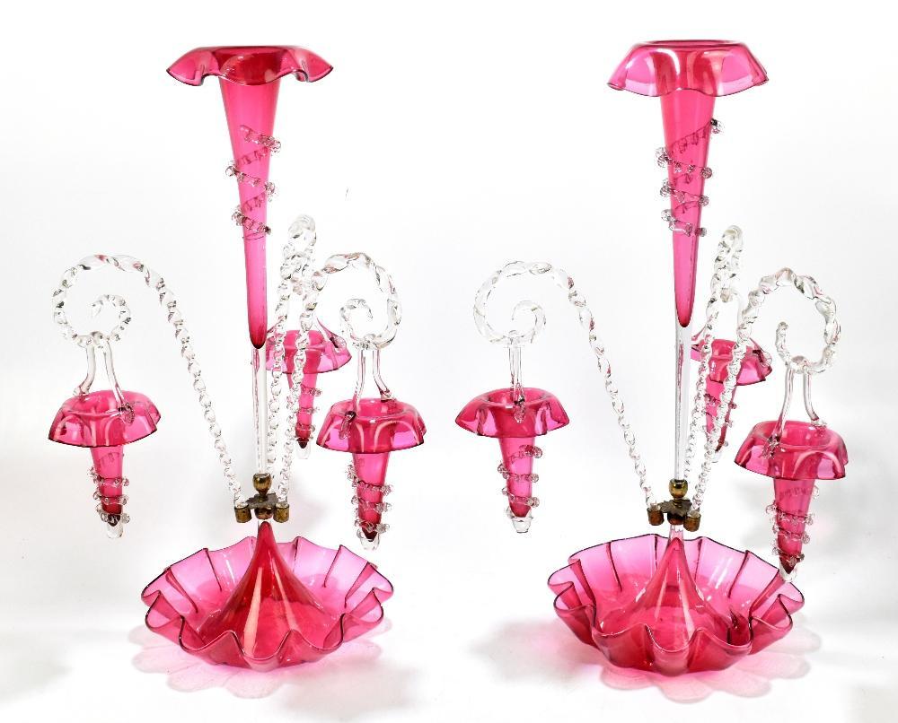 Pair of Victorian Cranberry & Clear Glass Epergnes
