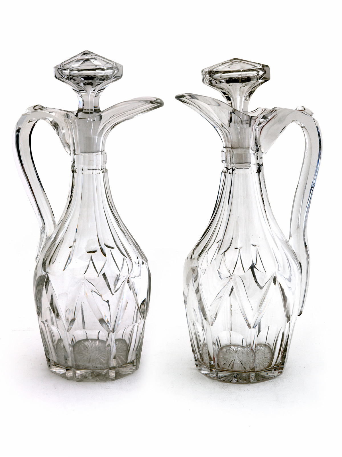 Pair of Victorian Cut Glass Claret Jugs with Deep Cut Bodies & Applied Scroll Handles
