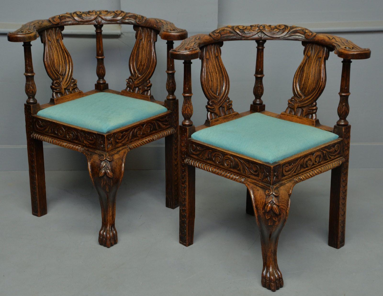 Pair of Victorian Elaborately Carved Oak Corner Chairs