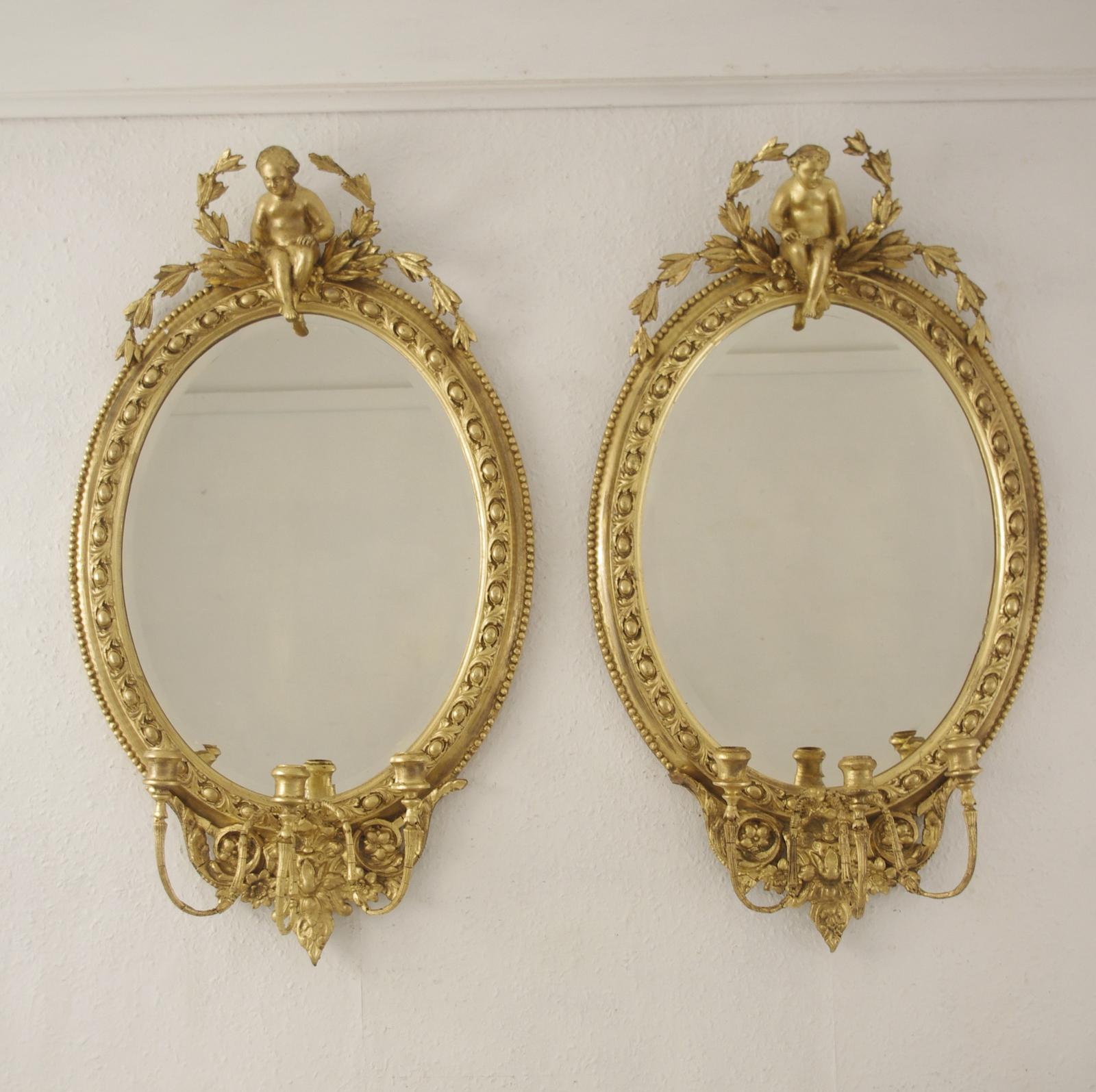 Pair of Victorian Gilt Oval Girandoles with Putto Cresting