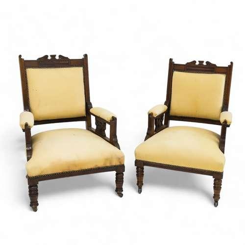 Pair of Victorian Hand Carved Walnut 'His & Hers' Parlour Armchairs